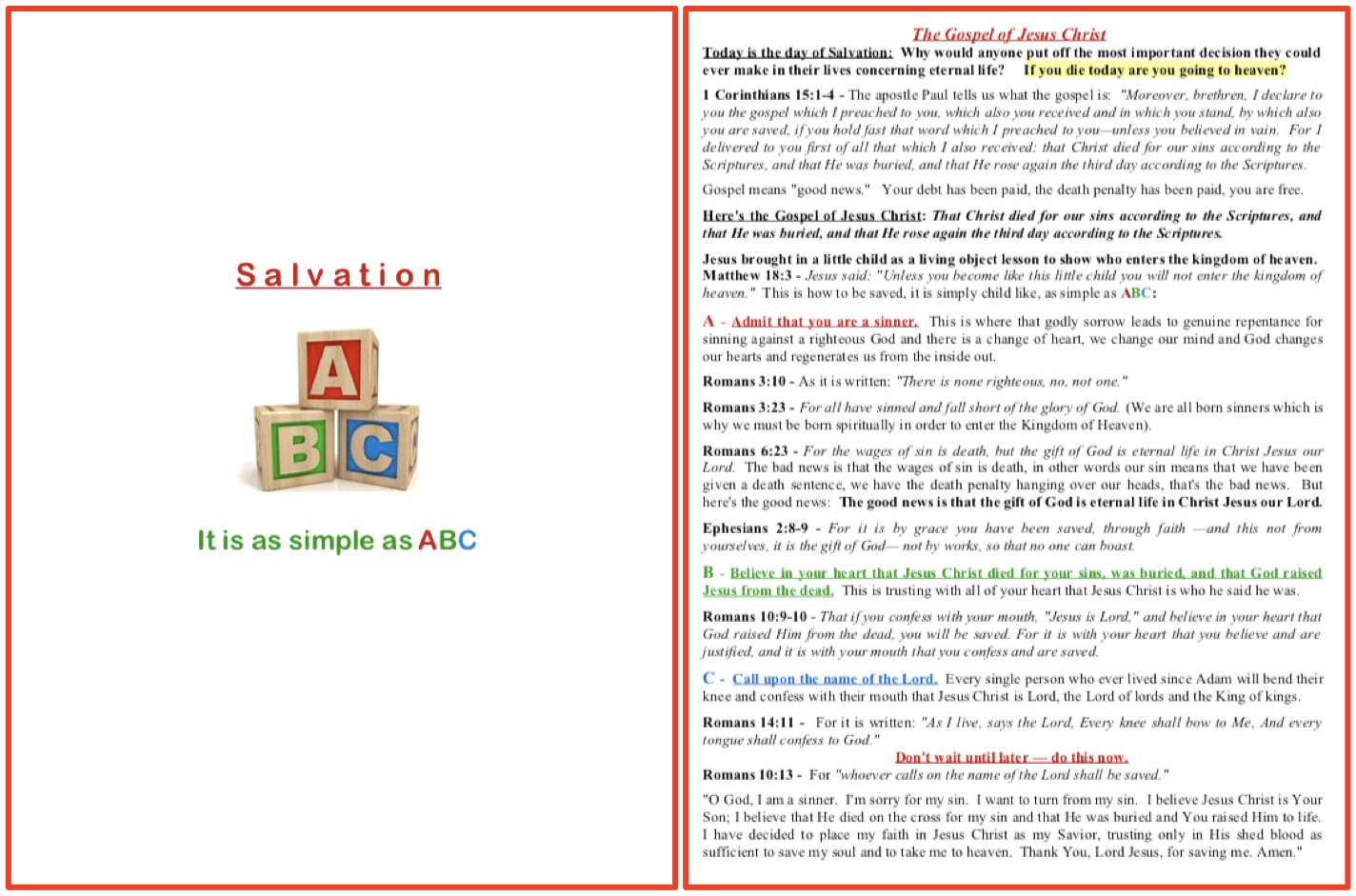 Abc of salvation printable in 1996 lifeway introduced a catchy way of helping boys and girls know how to respond to the good news of jesus christ. If i die today will i go to heaven? Today is the day of salvation.