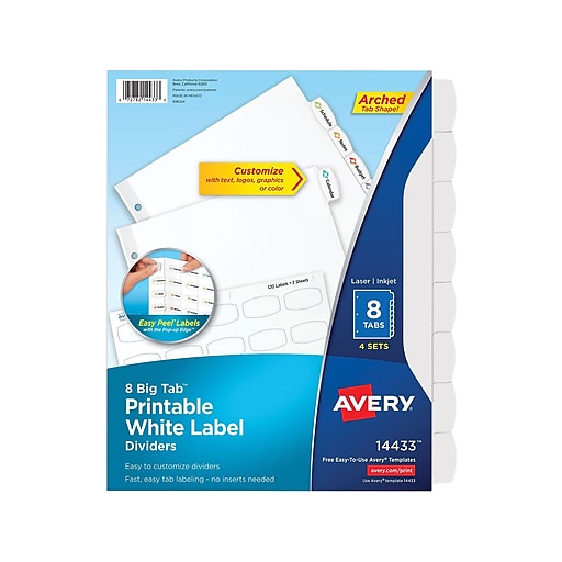 Avery Big Tab Printable White Label Dividers with Easy Peel 14433, 8 Tabs, 4 Sets Staples