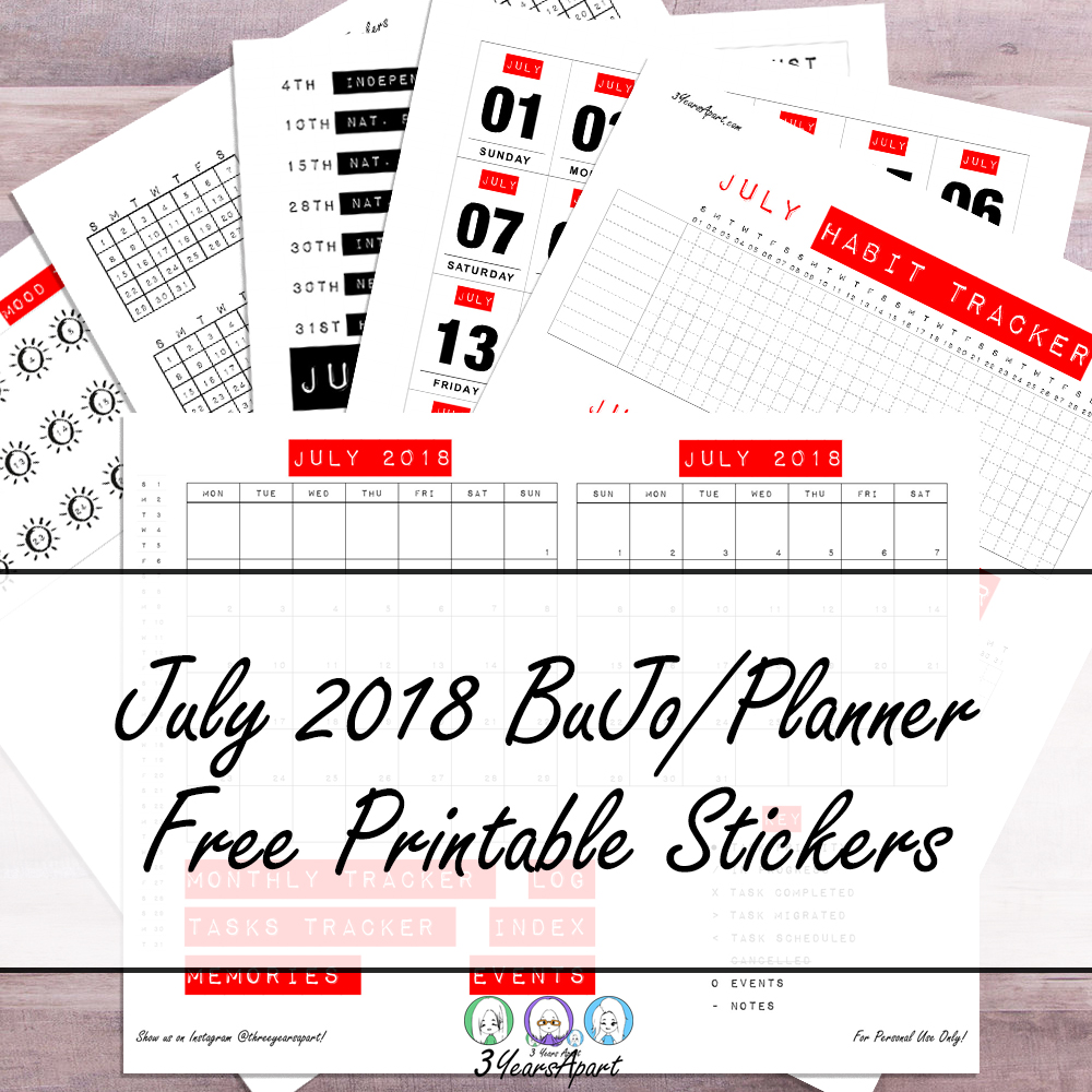 July 2018 Bundle Free Printable for Bullet Journals and Planner 3 Years Apart