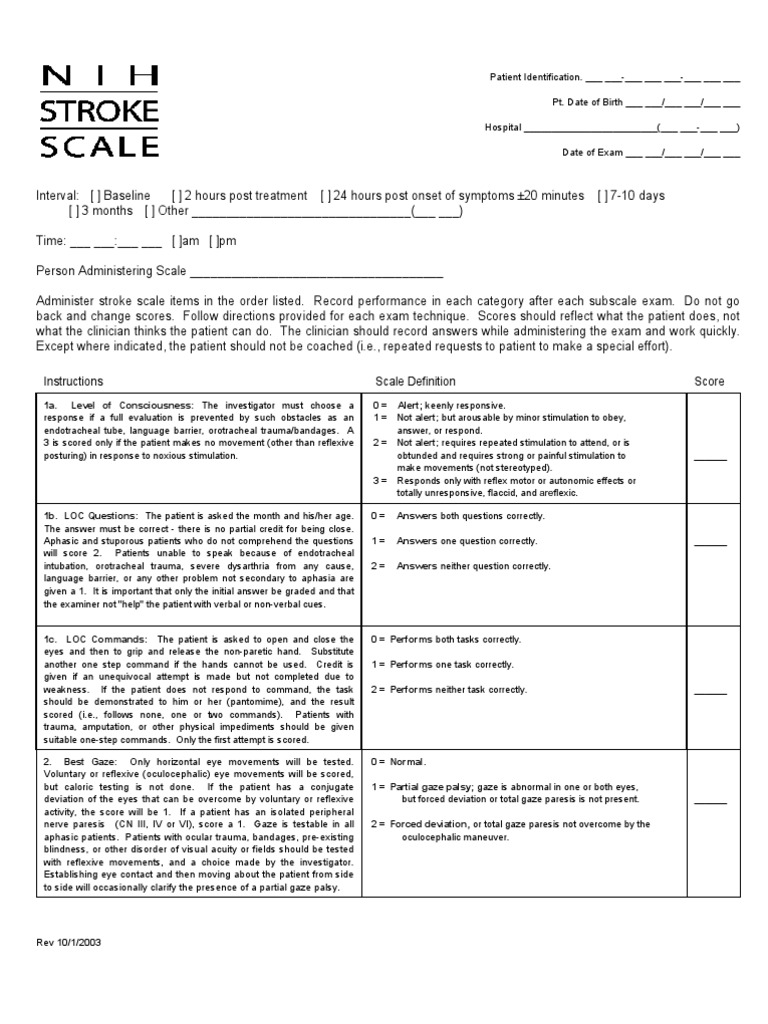 Level of consciousness (loc) 0 = alert, keenly responsive. Graphical version (pdf 1105 kb) (pdf, 1131 kb) | text. National institutes of health stroke scale (nihss) score instructions baselinescale definition date/time 24 hrs post tpa discharge date/time 1a.