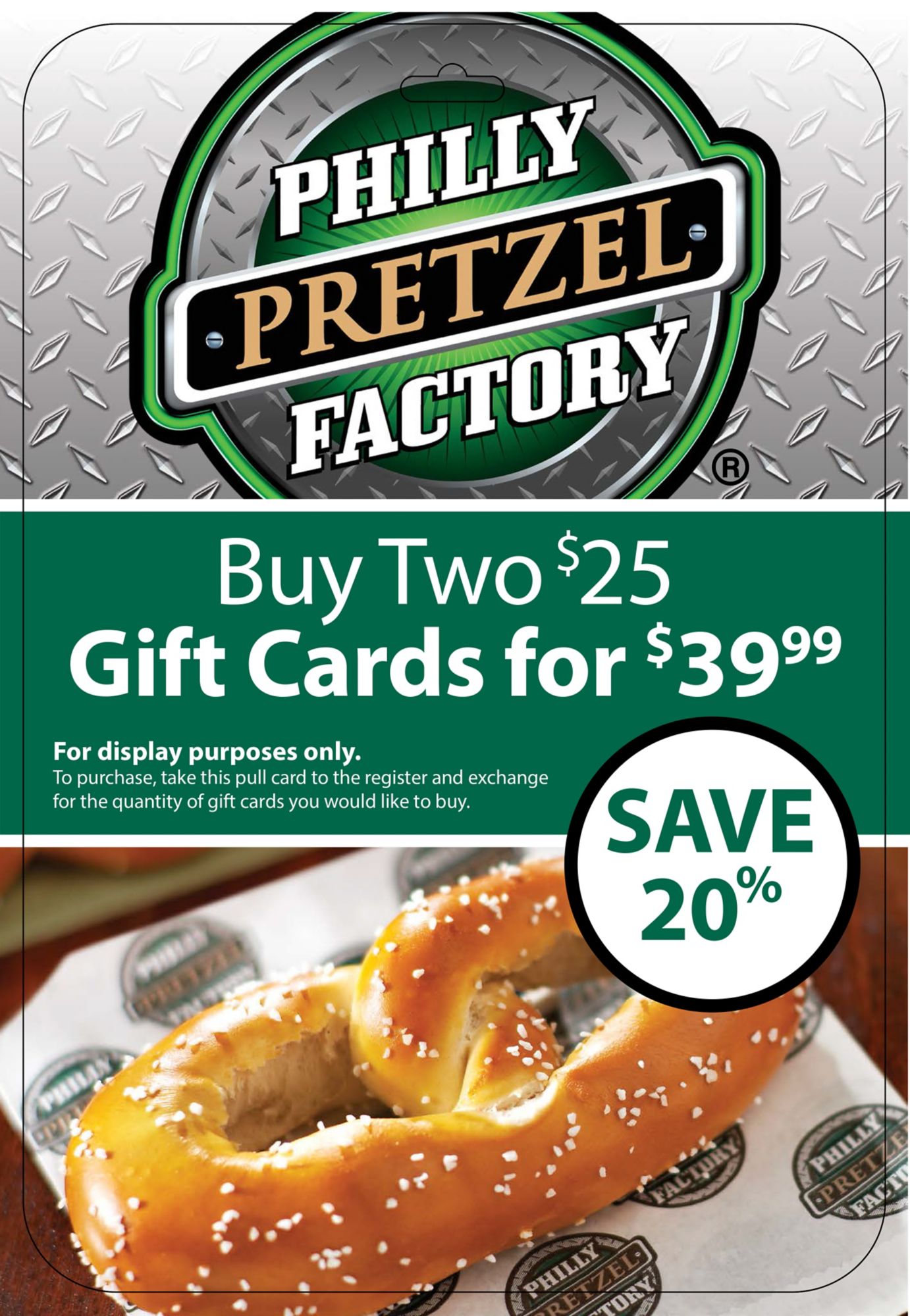 Get 2 pretzel dogs for $2 with this philly pretzel factory coupon good today, tuesday,. Free $10 the cheesecake factory egift card!. Save money with local coupons for home repair, restaurants, automotive, entertainment and.