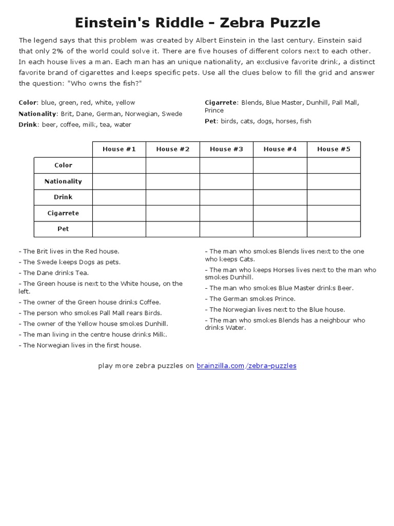 (worksheets only) crossing the bridge riddle. Great for those days when teens don't want to work. Web the famous einstein's riddle organised in a worksheet, with the reasoning to follow for the teacher. Zebra puzzles are a kind of logic problem composed similarly to the. (worksheets only) travelling the globe riddle. Web download and play for free our printable logic grid puzzles (pdf). Albert einstein draw and write page. The legend says that this problem was created by albert einstein in the last century. Web crossing the river riddle. The british man lives in a red house.