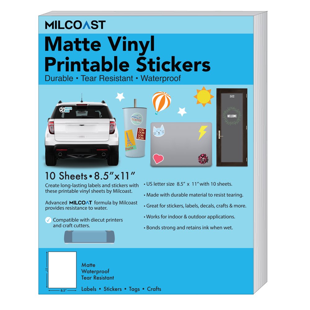 Milcoast Matte Waterproof Printable Vinyl Full Sheet Sticker Paper Labels Adhesive, Inkjet